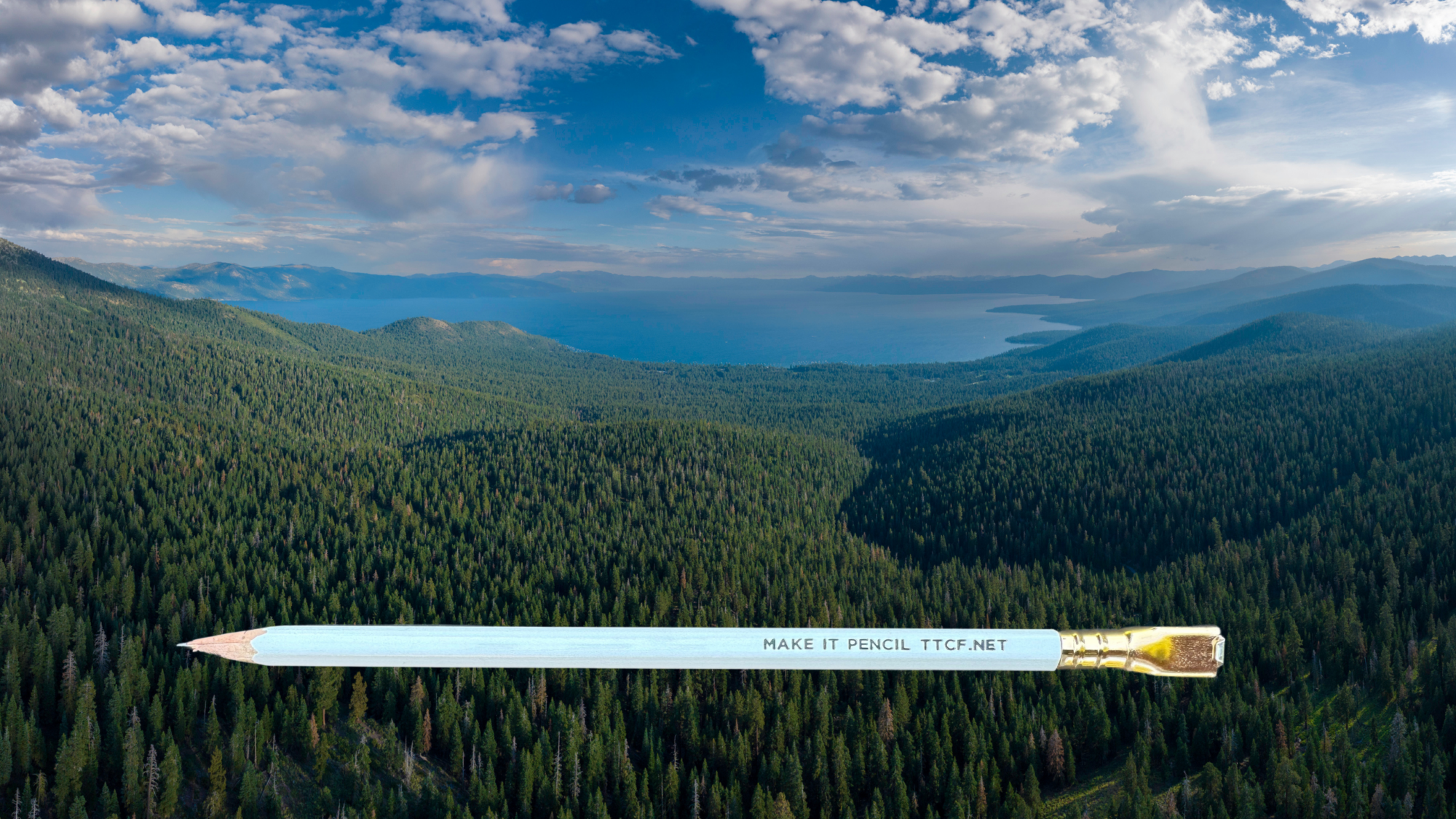 Lake Tahoe and the Tahoe Forest with a Make it Pencil Pencil encouraging philanthropy.