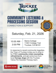 Includes free community crisis counseling, refreshments, and therapy dogs. Hosted by the Town of Truckee, Sierra College, the Humane Society of Truckee-Tahoe, and the Tahoe Truckee Suicide Prevention Coalition.
